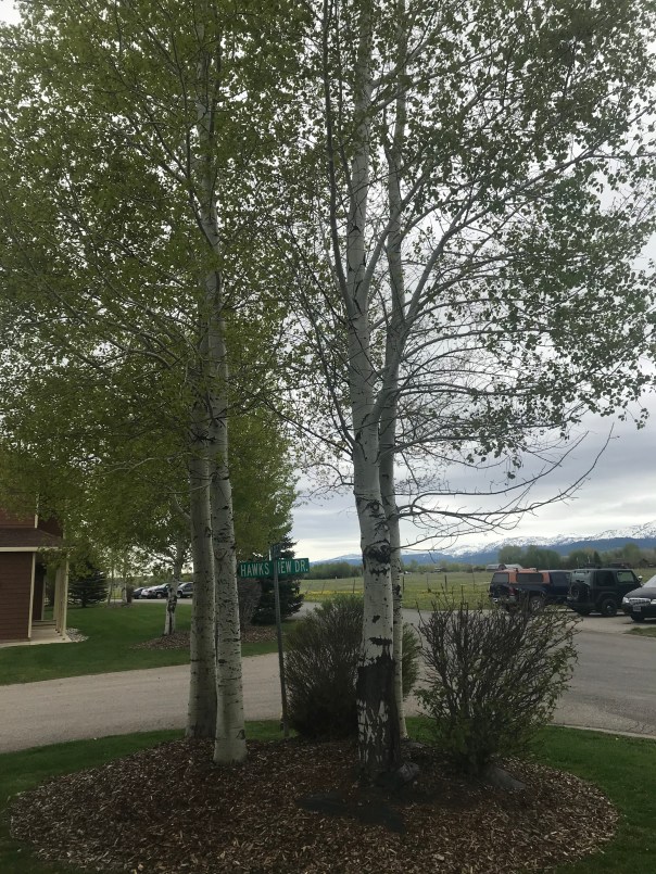 Our aspen fairy ring. Aspens share root systems and grow near water in groups. One of their adaptations for cold weather is their bark contains 30-50% as much chlorophyl as their leaves. Photo by Nina Wilkins